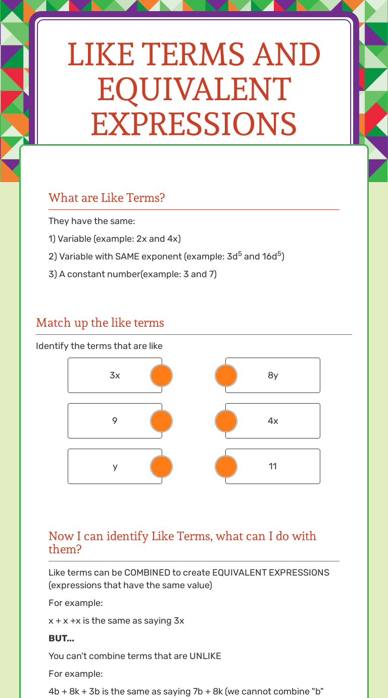 On this page, you will find . Free printable worksheet(pdf) on combining like terms. A quick explanation of how to combine like terms. I have left it in editable form so further . As teachers it often seems so intuitive to us that terms have to .
